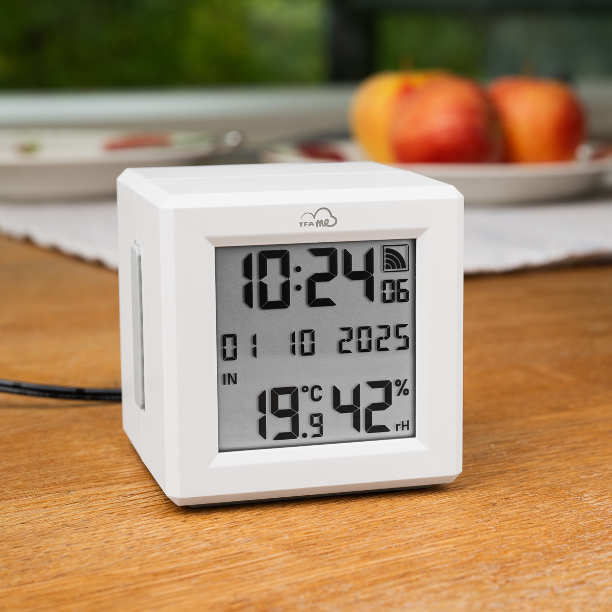 Kompakti ja helppokäyttöinen yhdyskäytävä toimii verkkovirralla ja voi käyttää AAA-paristoja varavirtana esimerkiksi sähkökatkon aikana. Lämpötilan ja kosteuden lisäksi näytössä näkyy päivämäärä (tai viikonpäivä) ja kellonaika.